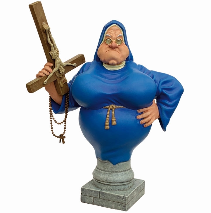 – L’emblématique nonne, au caractère bien trempé et aux formes opulentes, est ici armée de son crucifix, et prête à en découdre.