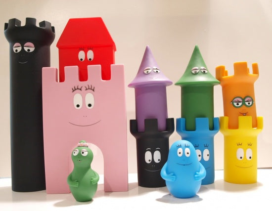 9 éléments de 10 à 28 cm en plastique souple pour construire et deconstruire le chateau barbapapa.
