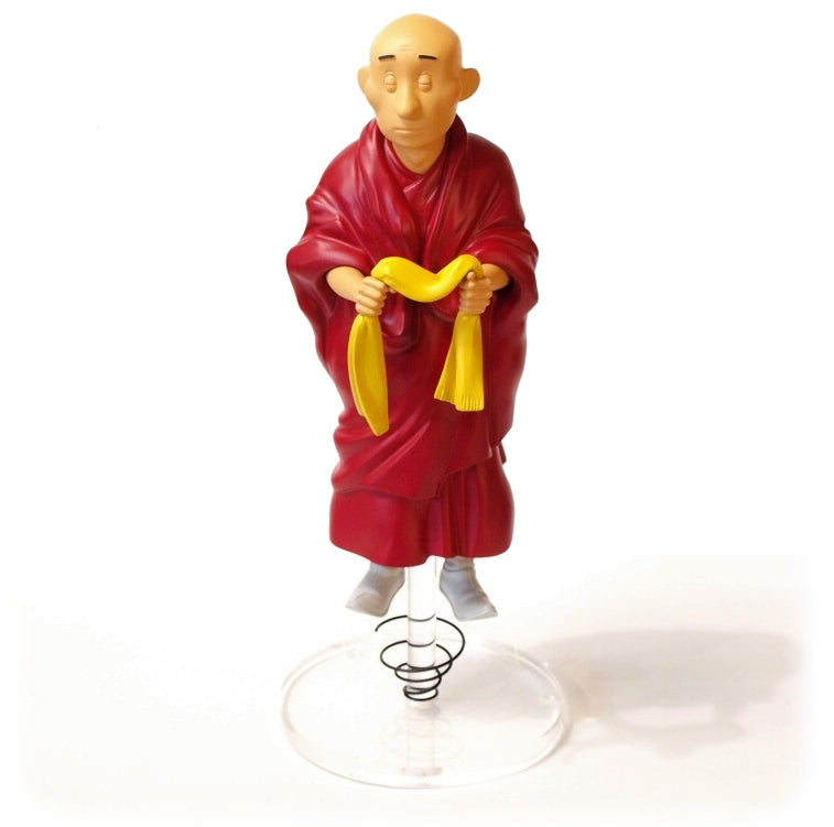 Statuette résine sur socle translucide avec une petite spirale qui reproduit le trait d'Hergé, et notre moine tibétain est en lévitation.