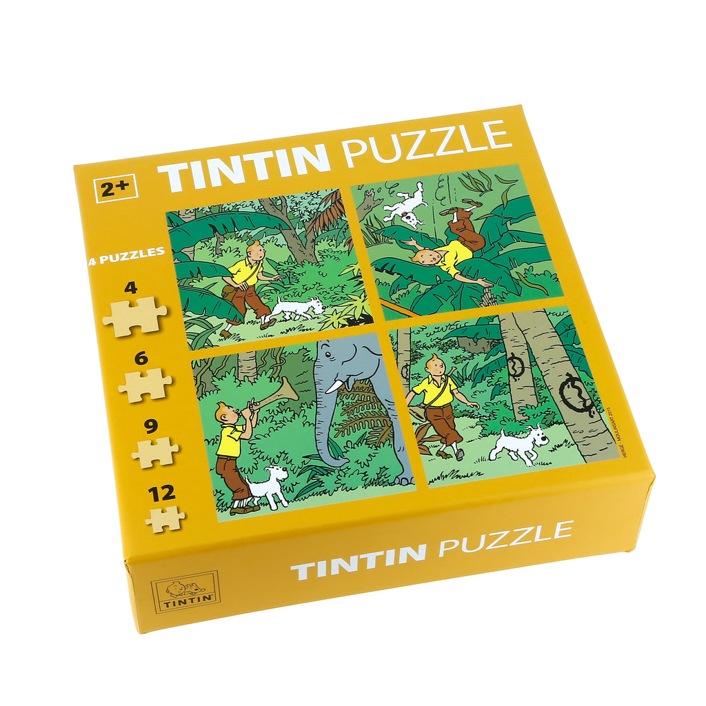 Cette boîte contient 4 puzzles Tintin au format 15 x 15 cm de 4, 6, 9 et 12 pièces