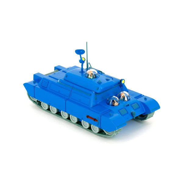 Figurines et véhicule en métal, présentés dans une boîte décor, accompagnés d'un livret explicatif sur les inspirations d'Hergé pour le dessin des véhicules.