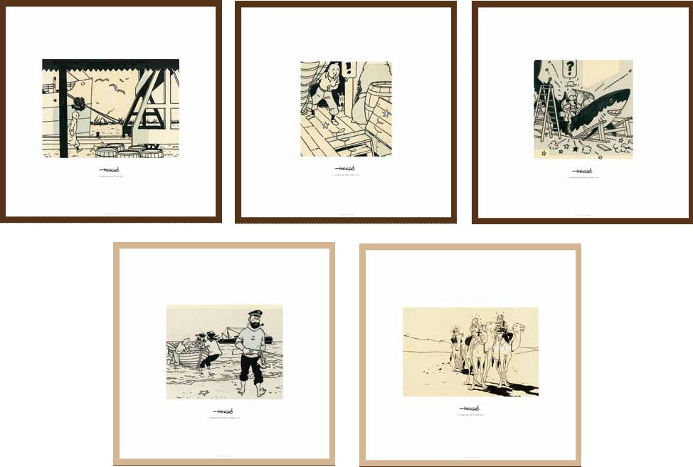 Illustrations tirées des albums "le crabe aux pinces d'or" et "le trésor de Rackham le Rouge"; encre de chine, aquarelle et gouache sur papier à dessin.