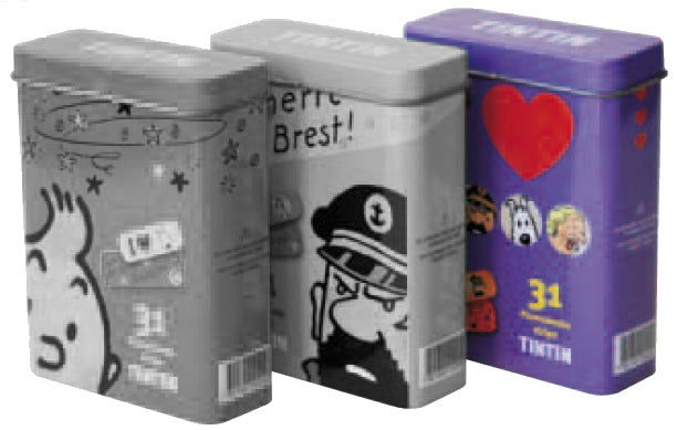 Boîte métallique contenant 31 pansements stériles aux couleurs des héros de Hergé.